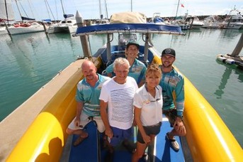 Ocean Rafting crew Gosta Ehrnst, Peter Hearnshaw of Airlie Beach Tourism, Todd Robertson, owner of Ocean Rafting Jan Claxton and Tom Jones on their return from Whitehaven Beach.