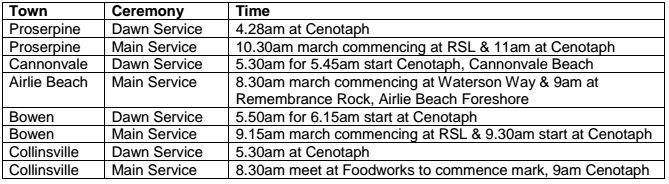 “I encourage everyone to attend a service, I will be attending the dawn service in Proserpine and the main service in Bowen, with Councillors attending their local services across the region,” she said.