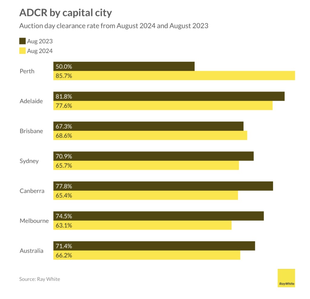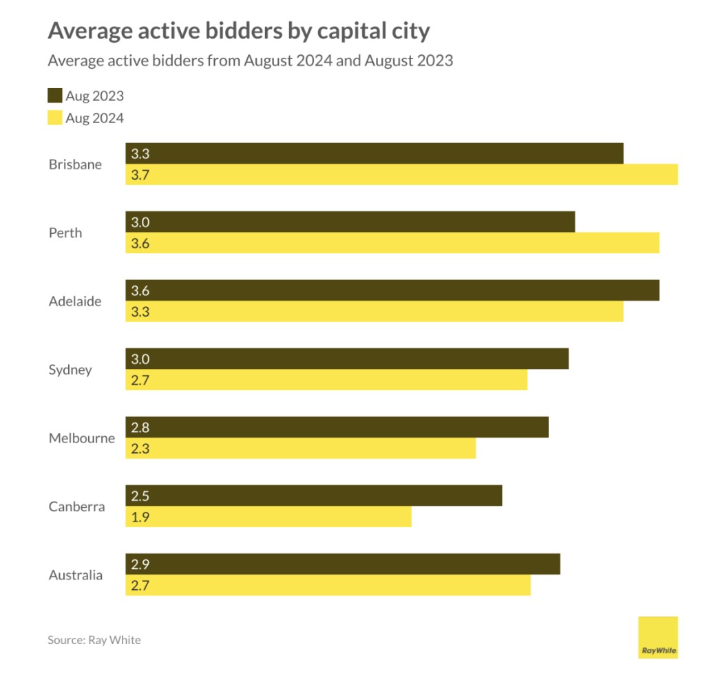 In August, Ray White conducted 3,534 auctions nationally, an increase of 15 per cent compared to the number of auctions held at the same time last year. With auction numbers increasing, we have also seen a fall in the number of active bidders. In August, there were 2.7 people on average actively bidding. This is a decline from 2.9 people from the same time last year.