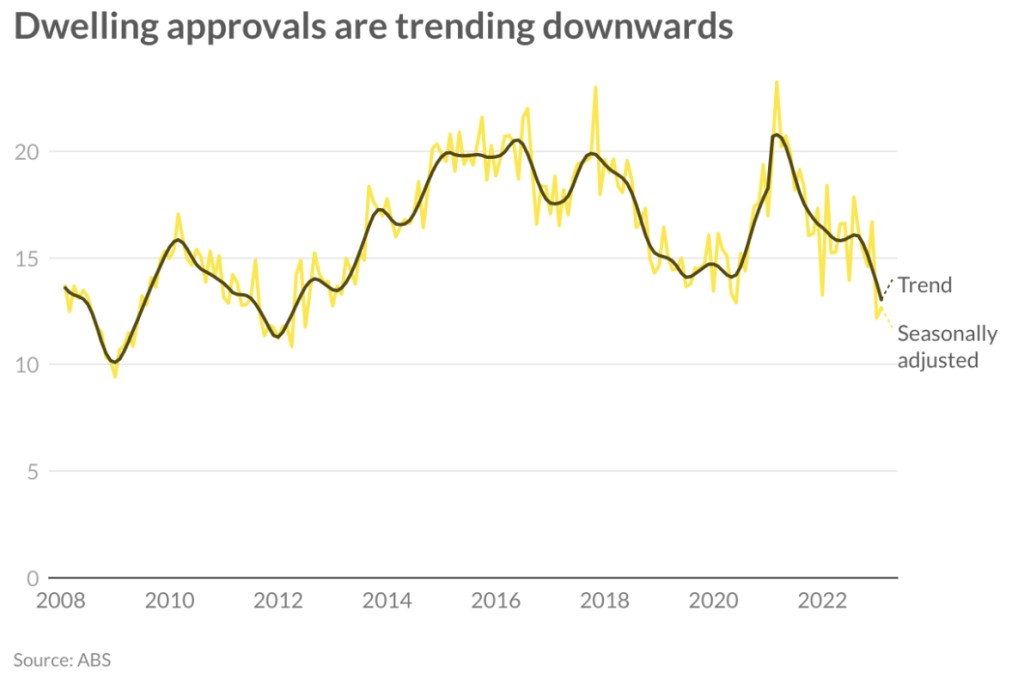 The number of new homes being approved is now trending to its lowest level in over a decade. In February, 12,661 dwellings were approved, a 30 per cent decline from 12 months ago. In historic terms, this is exceedingly low but many of these homes will not be built quickly given construction cost increases. Many people who would otherwise have bought a new home will be pushed to the established market. Either because the cost to build a new home is too high, it is difficult to find a builder or simply there is no availability in the suburb they want to live in.