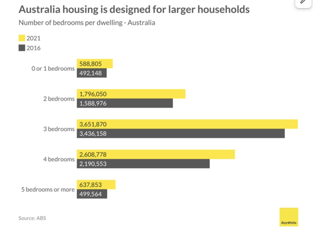 Not only do we need more homes for more people, we are also spreading out more, and most of our homes have been built for big families, containing three or more bedrooms. The household type that is set to see the strongest growth is ‘single person’ and households are getting smaller. At the same time, the house type with the strongest growth currently has four bedrooms. This is leading to a lot of spare capacity in homes. Remarkably, 75.4 per cent of couples without children live in homes with two or more spare bedrooms. This disconnect between household size and housing stock points to a deeper structural issue in the market.
