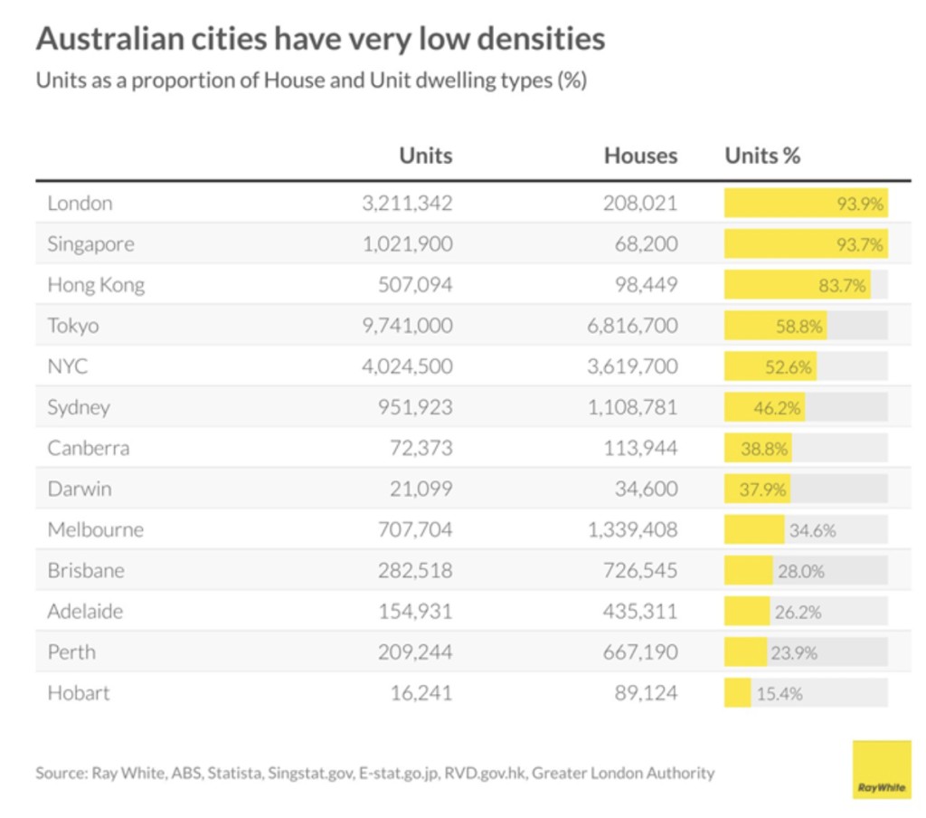 Australian cities face unique challenges in adapting to these changes. Compared to international cities like London and Singapore, where over 90 per cent of dwellings are units, Australian cities remain predominantly low-density. Melbourne and Sydney have just 34.6 per cent and 46.2 per cent units respectively, making it harder to meet changing housing needs efficiently.