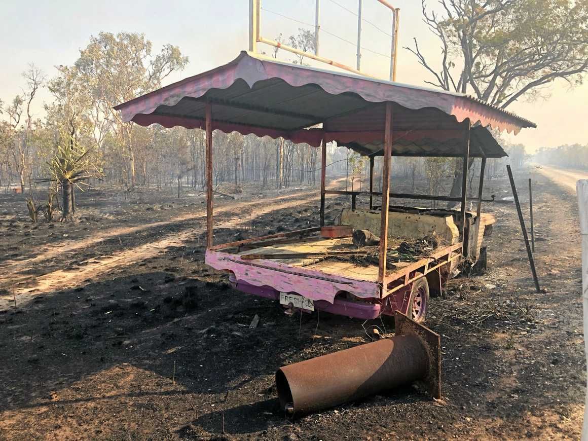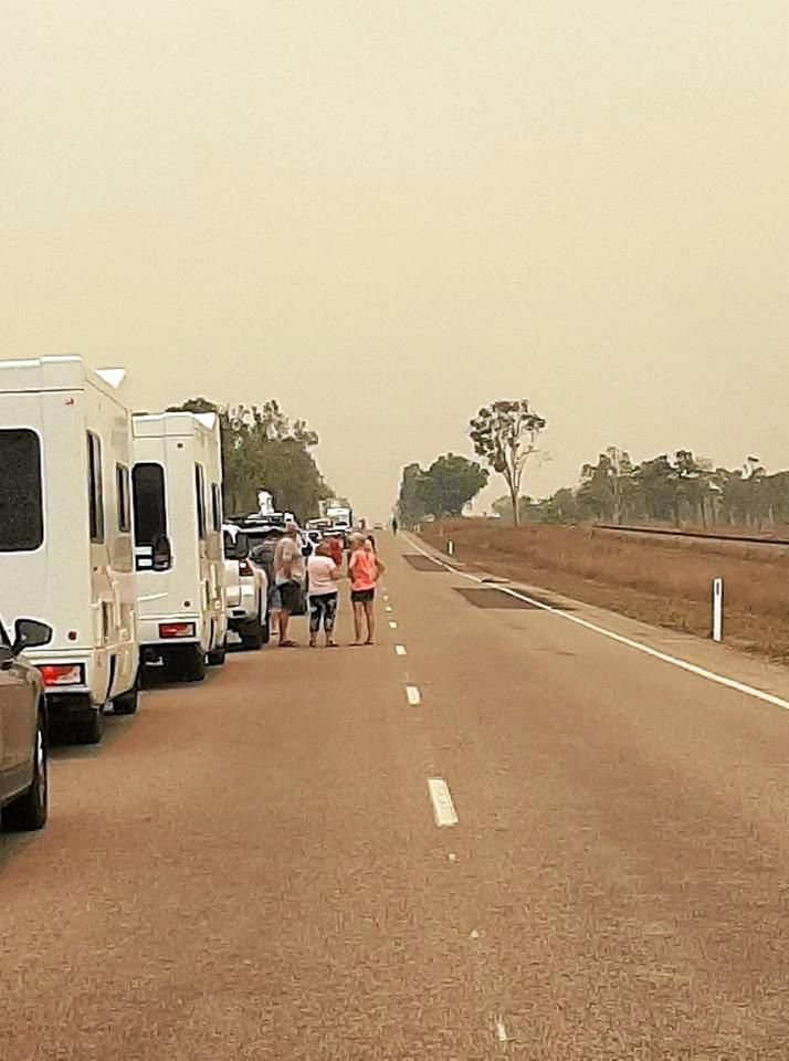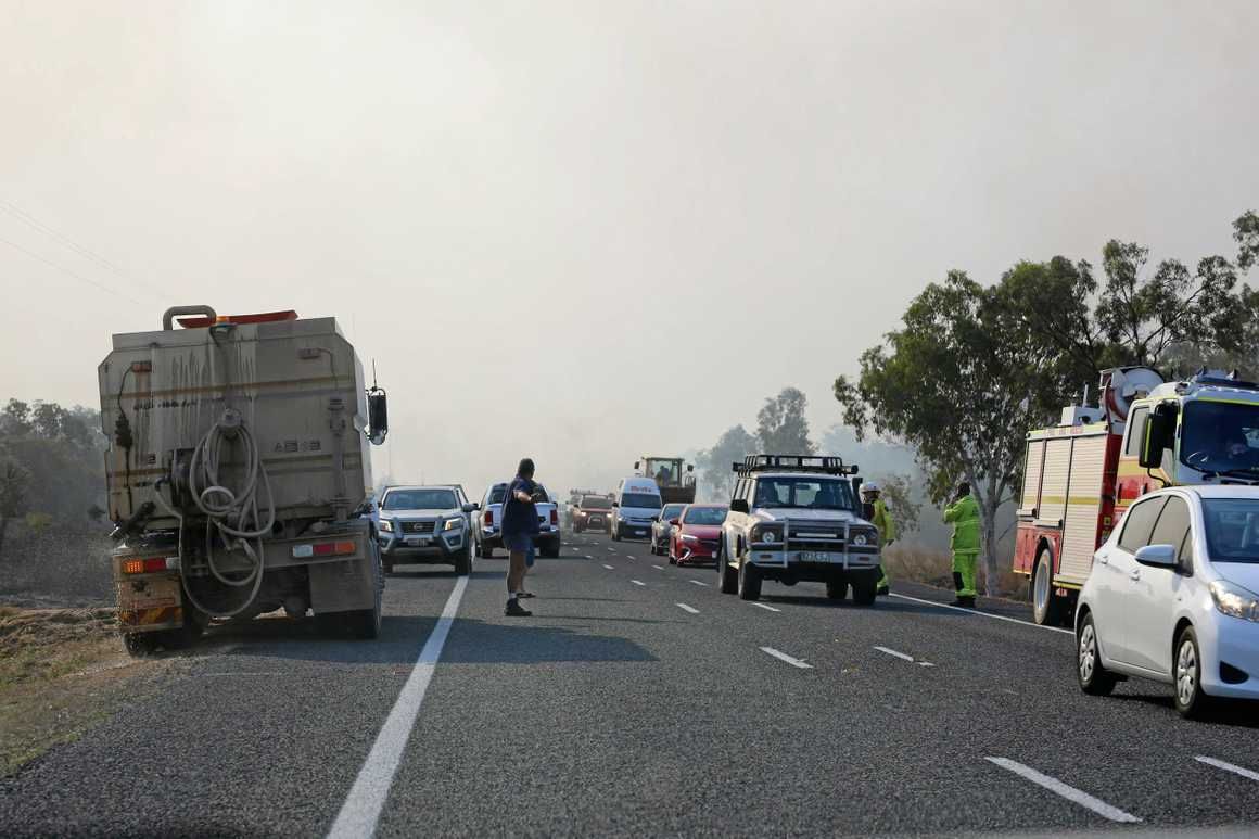 Cars backed up for a kilometre as the out-of-control blaze burning in tea tree flats near Gregory River forced police to close the road this morning.