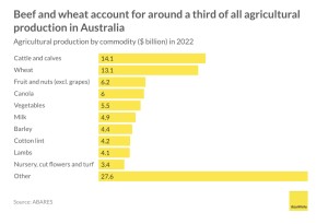 Australia’s two main agricultural products are wheat and beef and these accounted for a third of all production by value last year. Wool, historically important for Australia, now doesn’t even make it into the top 10 commodities by value. Nursery cut flowers and turf became a higher value commodity with $3.4 billion of production in 2022, compared to $3.2 billion for wool.