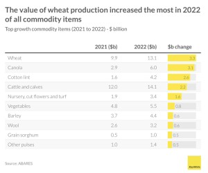 However, the top performer for growth in 2022 was wheat. The total value of wheat production increased by $3.3 billion in 2022, hitting an all time high of $13.1 billion. Canola and cotton lint also saw large increases, more than doubling. This strong performance in wheat had a strong flow on impact to farming communities and farm values. It also resulted in record house price rises in many wheat farming regions.