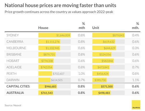 Both houses and units have enjoyed an uptick in values however houses continue to grow at a more rapid pace. Perth houses are leading the charge with a one per cent increase to a $702,607 median. Perth, Brisbane, Adelaide and Darwin house prices have already overtaken peak values recorded during 2022 however, all other markets are on a runway to a similar result with the capital cities house price recording 0.8 per cent gain this month.