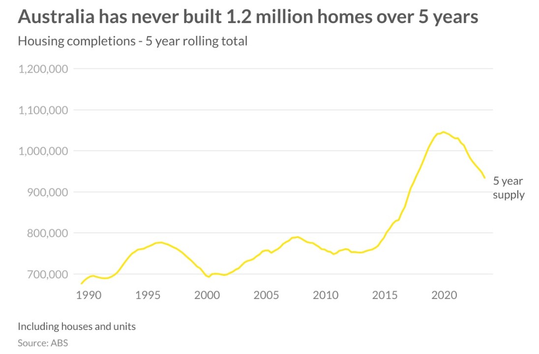 The rental crisis, soaring house prices despite much higher interest rates and being one of the least affordable countries in the world could be solved if we built more homes. For this reason, the Federal Government announced a target of 1.2 million new homes over five years from 2024. We have never built this many homes over a five year period and unfortunately we are already off to a bad start.