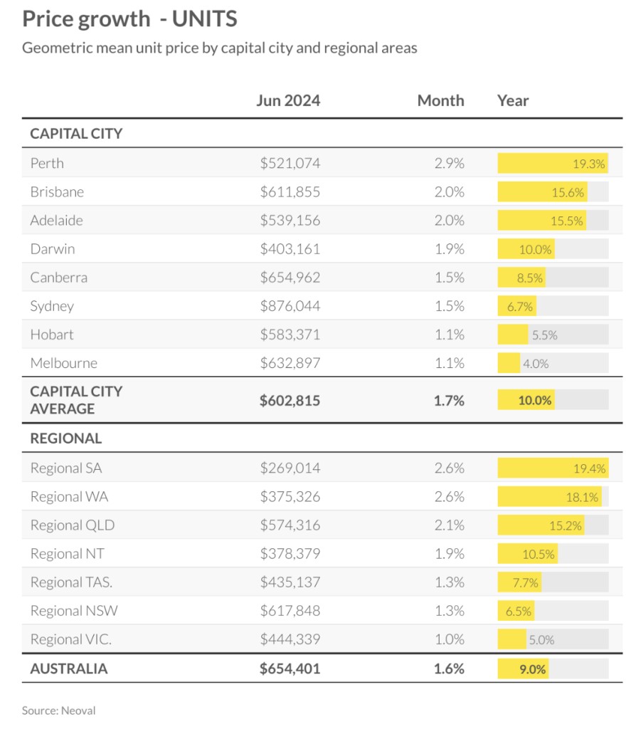 The unit market mirrors house market trends. All areas show positive growth, with Melbourne and Hobart trailing at 1.3 per cent and 1.5 per cent respectively. Perth leads at 2.9 per cent, followed closely by Brisbane and Adelaide. Sydney and Canberra show more modest yet positive annual growth at 6.7 per cent and 8.5 per cent. Regional unit prices keep pace with capital cities, rising 1.6 per cent monthly and nine per cent annually.