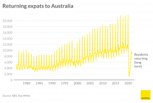 In the June quarter, 59,380 Australian residents returned to Australia. And although there is a lot of discussion about expats returning, 85 per cent of them were back only temporarily to visit friends and relatives. The remaining 15 per cent back permanently were mainly from New Zealand, driven by the more relaxed restrictions with travel to Australia. With most Australians returning here for just a short time period, and most of them from New Zealand, the expat market for Australia’s premium property is likely to be relatively small. But anecdotally, it does appear to be making an impact on some of our more expensive suburbs. It is also likely being driven by expats not quite ready to return but keen to park their money in Australia’s surging property market.