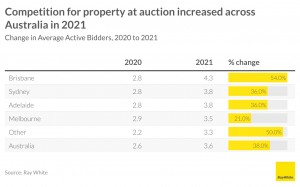 The year 2021 was the most competitive year for properties selling at auction that we have ever recorded. Average active bidders for the year hit 3.6, an increase from 2.6 in 2020 and 2.4 in 2019. The city that saw the biggest jump between 2020 and 2021 was Brisbane. Despite a big uptick in auctions conducted this year (increasing from 1,344 in 2020 to 2,031 in 2021 (YTD), Brisbane also saw a big increase in the number of people actively bidding, up 54 per cent to 4.3.