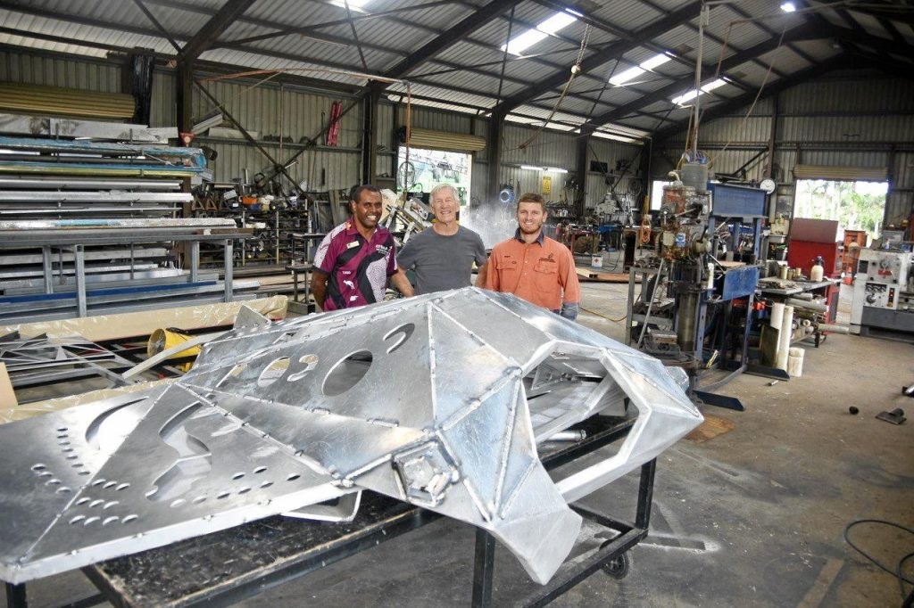 Showing off the manta ray sculpture to go on display at Whitsunday Coast Airport is artist Adriaan Vandelugt (centre), Arthur Gabey who designed the Indigenous motif (left) and Scott Lee from Strathdickie Engineering who helped fabricate it (right).